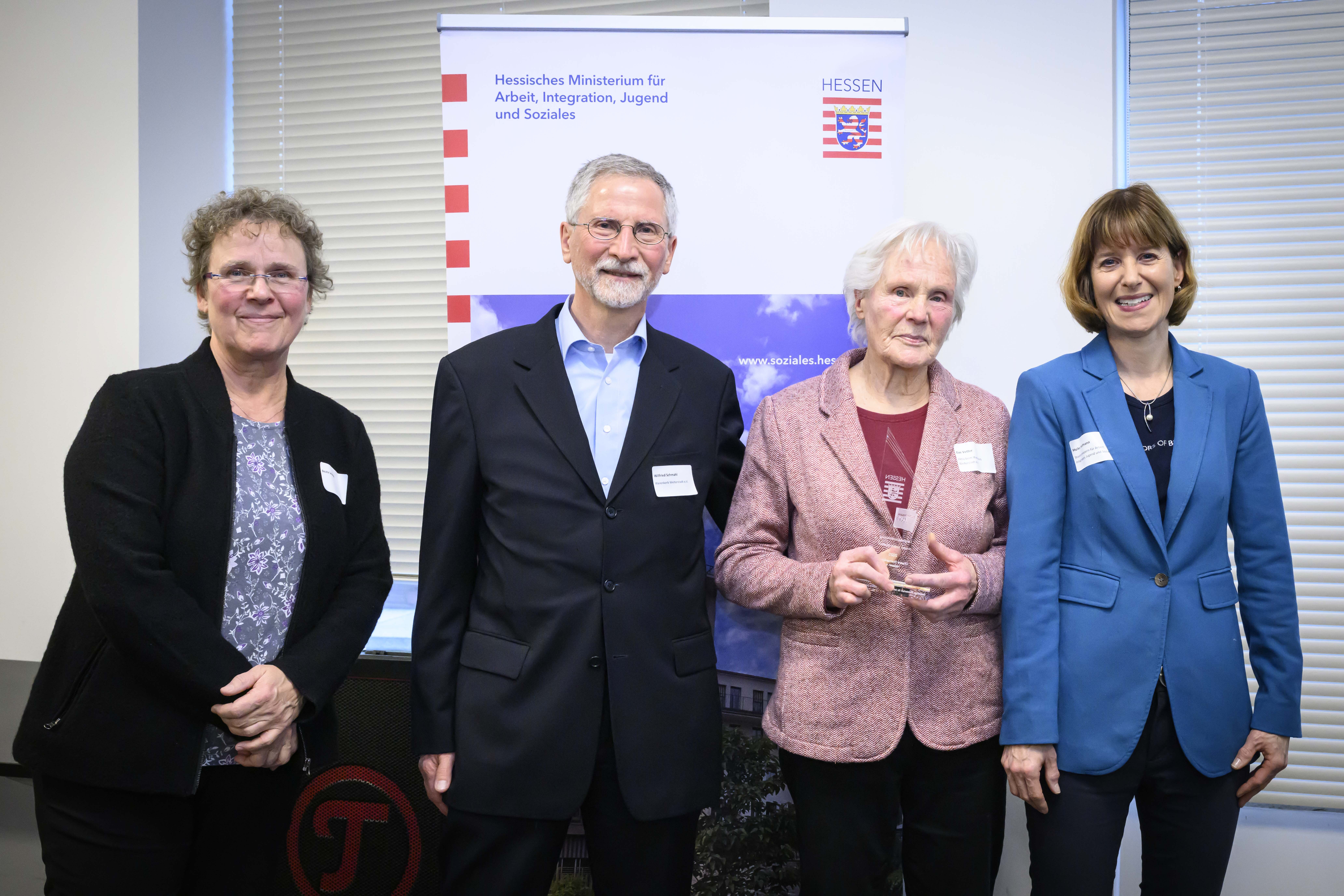 Beate Schmahl (Tochter der Gewürdigten und Begleitperson), Wilfried Schmahl (Vorstandsmitglied Warenkorb Weiterstadt e.V.) und die Gewürdigte Eve Vetter, Empfängerin der Landesauszeichnung und engagiert im Warenkorb Weiterstadt e.V., Frau Staatsministerin