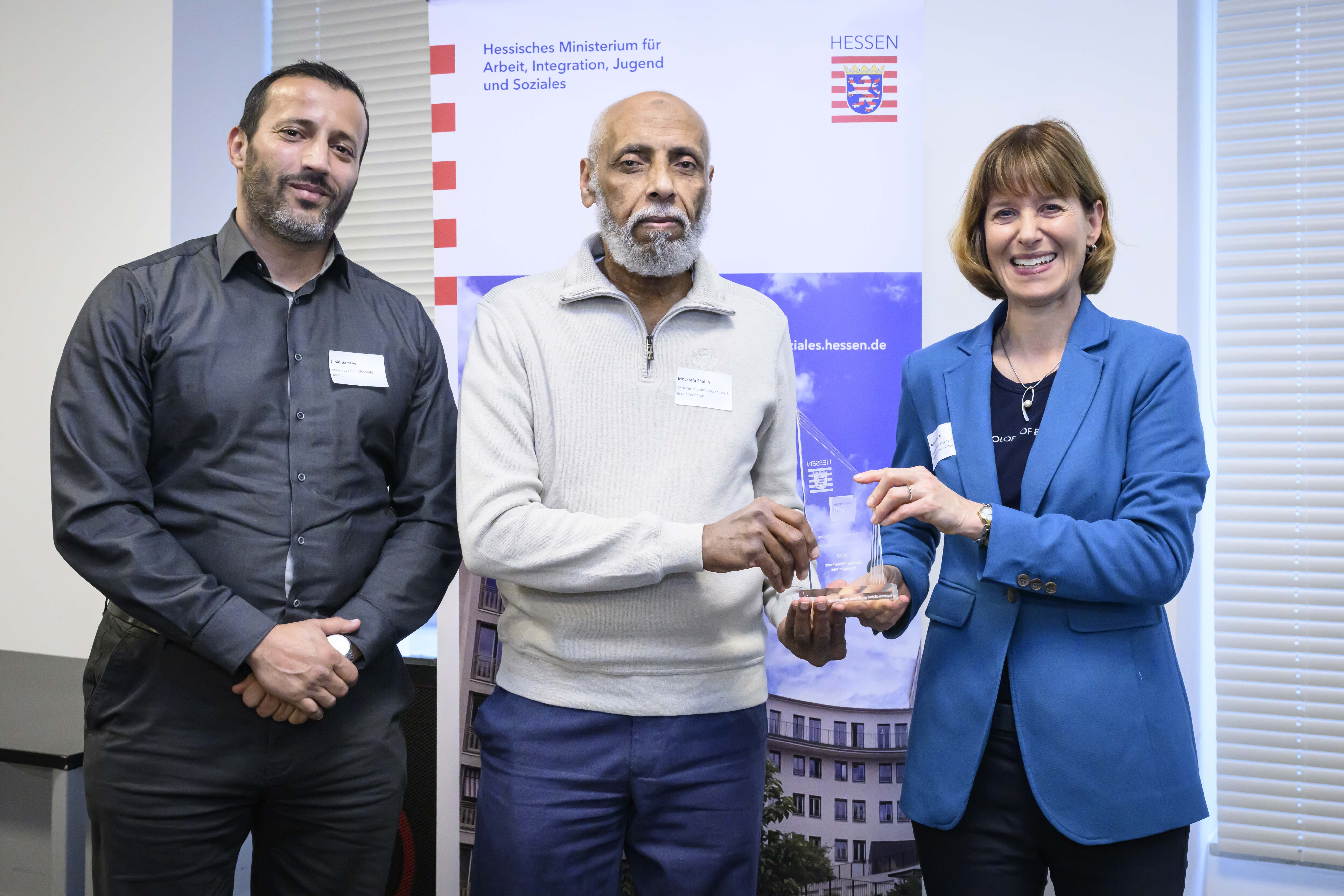 Jaoid Darsane (Begleitperson des Gewürdigten), Moustafa Shahin (Empfänger der Landesauszeichnung und engagiert für migrant. Jugendliche & in der Seelsorge) mit Frau Staatsministerin