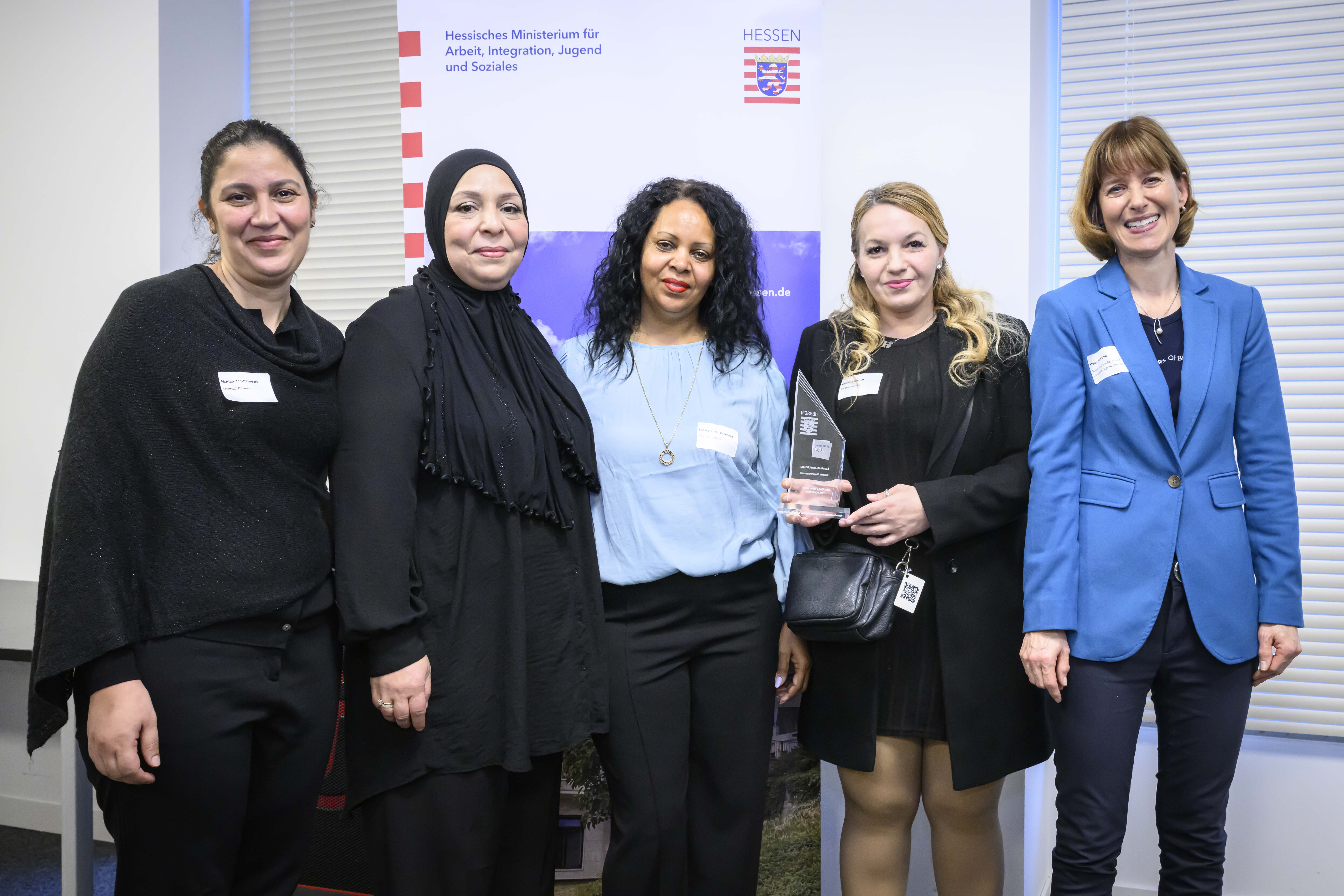 Die Stadtteil-Flüsterinnen aus Preungesheim: Mariam El Ghazouani, Samira Massi, Kahsay Guven Kebedesch, Frau Staatsministerin und Christina Schmidt